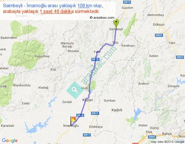 Saimbeyli - İmamoğlu arası yaklaşık olarak 90 km/h ile yukarıda belirtilen sürede olup, iki yerin kuş uçuşu uzaklığı (mesafesi) 89'dir. Yolculuk otobüsle 2 saat 17 dakika sürmektedir.