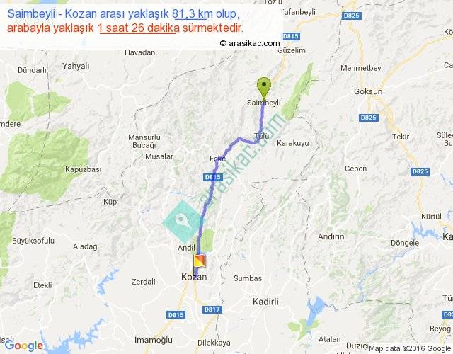 Saimbeyli - Kozan arası yaklaşık olarak 90 km/h ile yukarıda belirtilen sürede olup, iki yerin kuş uçuşu uzaklığı (mesafesi) 64'dir. Yolculuk otobüsle 1 saat 51 dakika sürmektedir.
