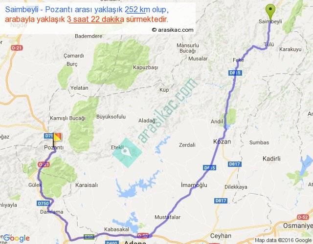 Saimbeyli - Pozantı arası yaklaşık olarak 90 km/h ile yukarıda belirtilen sürede olup, iki yerin kuş uçuşu uzaklığı (mesafesi) 123'dir. Yolculuk otobüsle 4 saat 22 dakika sürmektedir.