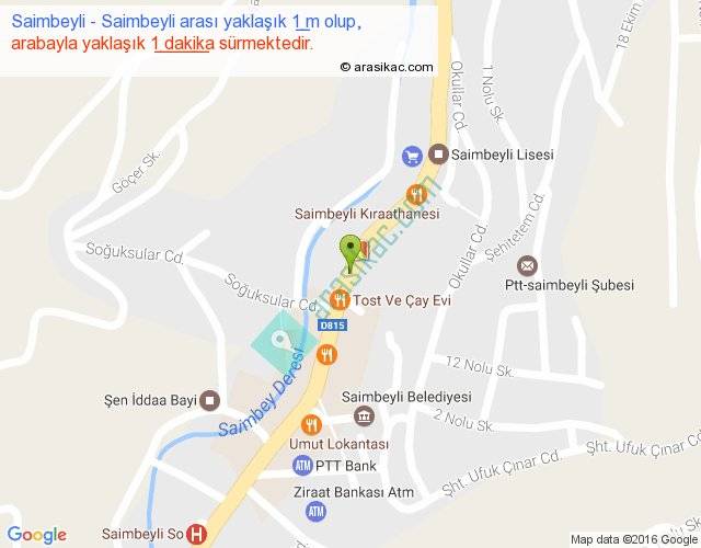 Saimbeyli - Saimbeyli arası yaklaşık olarak 90 km/h ile yukarıda belirtilen sürede olup, iki yerin kuş uçuşu uzaklığı (mesafesi) 0'dir. Yolculuk otobüsle 1 dakika sürmektedir.
