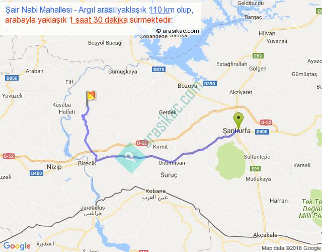 Şair Nabi Mahallesi - Argıl arası yaklaşık olarak 90 km/h ile yukarıda belirtilen sürede olup, iki yerin kuş uçuşu uzaklığı (mesafesi) 73'dir. Yolculuk otobüsle 1 saat 57 dakika sürmektedir.