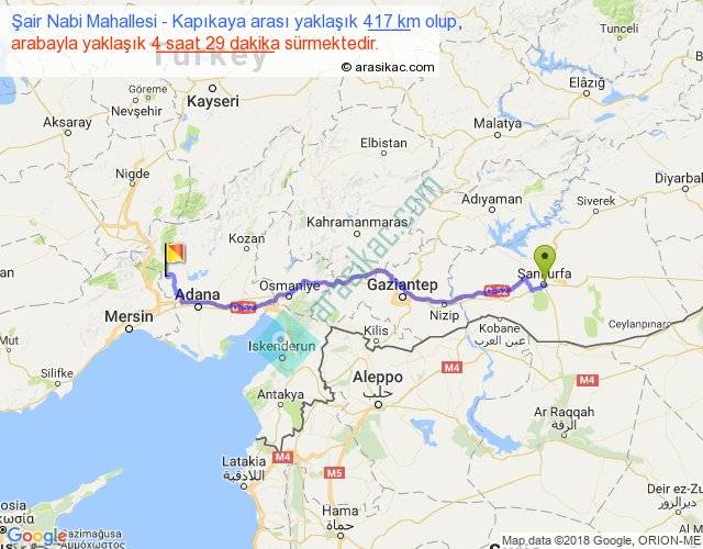 Şair Nabi Mahallesi - Kapıkaya arası yaklaşık olarak 90 km/h ile yukarıda belirtilen sürede olup, iki yerin kuş uçuşu uzaklığı (mesafesi) 333'dir. Eğer belirtilen yerler arasında uçak seferi var ise bu süre uçakla 30 dakika'ya kadar düşebilir. Yolculuk otobüsle 5 saat 49 dakika sürmektedir.