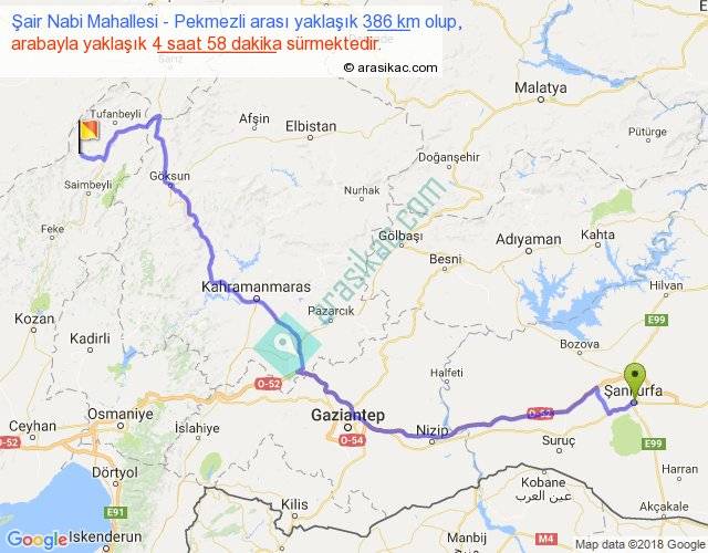 Şair Nabi Mahallesi - Pekmezli arası yaklaşık olarak 90 km/h ile yukarıda belirtilen sürede olup, iki yerin kuş uçuşu uzaklığı (mesafesi) 264'dir. Eğer belirtilen yerler arasında uçak seferi var ise bu süre uçakla 24 dakika'ya kadar düşebilir. Yolculuk otobüsle 6 saat 27 dakika sürmektedir.