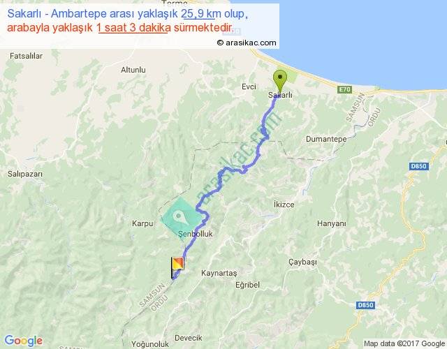 Sakarlı - Ambartepe arası yaklaşık olarak 90 km/h ile yukarıda belirtilen sürede olup, iki yerin kuş uçuşu uzaklığı (mesafesi) 17'dir. Yolculuk otobüsle 1 saat 21 dakika sürmektedir.