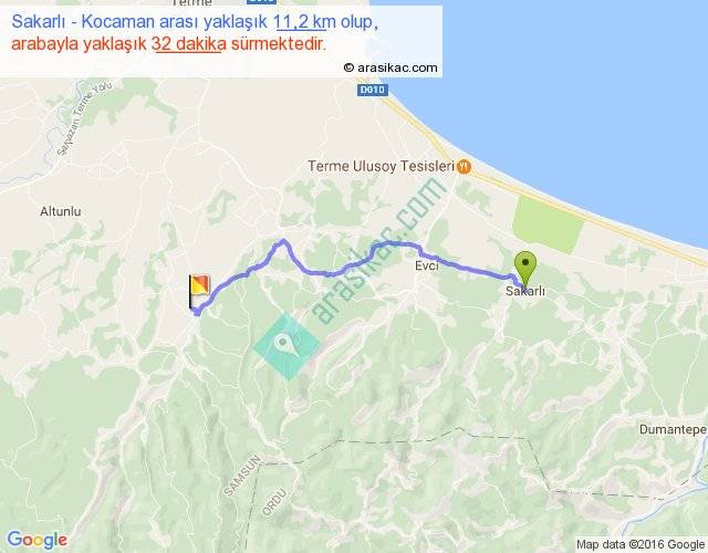 Sakarlı - Kocaman arası yaklaşık olarak 90 km/h ile yukarıda belirtilen sürede olup, iki yerin kuş uçuşu uzaklığı (mesafesi) 9'dir. Yolculuk otobüsle 41 dakika sürmektedir.