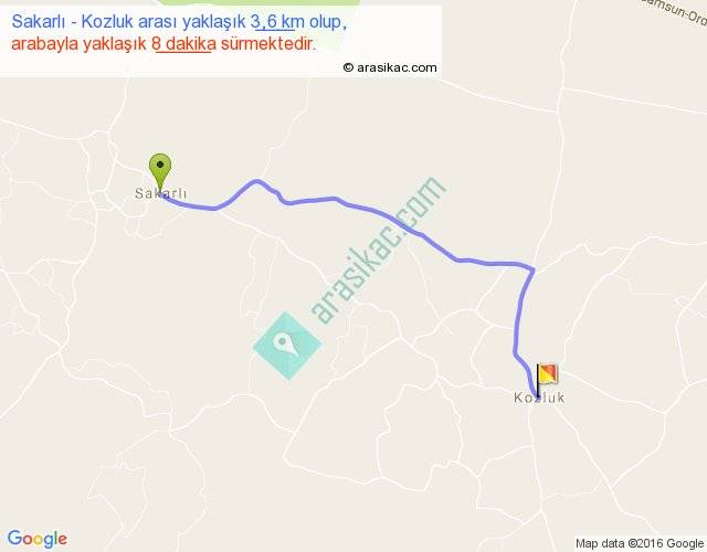 Sakarlı - Kozluk arası yaklaşık olarak 90 km/h ile yukarıda belirtilen sürede olup, iki yerin kuş uçuşu uzaklığı (mesafesi) 3'dir. Yolculuk otobüsle 10 dakika sürmektedir.
