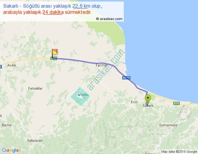 Sakarlı - Söğütlü arası yaklaşık olarak 90 km/h ile yukarıda belirtilen sürede olup, iki yerin kuş uçuşu uzaklığı (mesafesi) 20'dir. Yolculuk otobüsle 31 dakika sürmektedir.