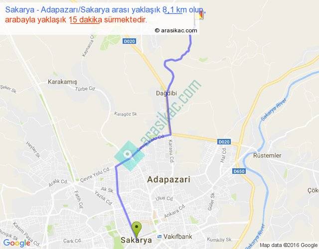 Sakarya - Adapazarı Sakarya arası yaklaşık olarak 90 km/h ile yukarıda belirtilen sürede olup, iki yerin kuş uçuşu uzaklığı (mesafesi) 6'dir. Yolculuk otobüsle 19 dakika sürmektedir.