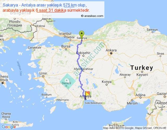 Sakarya - Antalya arası yaklaşık olarak 90 km/h ile yukarıda belirtilen sürede olup, iki yerin kuş uçuşu uzaklığı (mesafesi) 429'dir. Eğer belirtilen yerler arasında uçak seferi var ise bu süre uçakla 39 dakika'ya kadar düşebilir. Yolculuk otobüsle 8 saat 28 dakika sürmektedir.