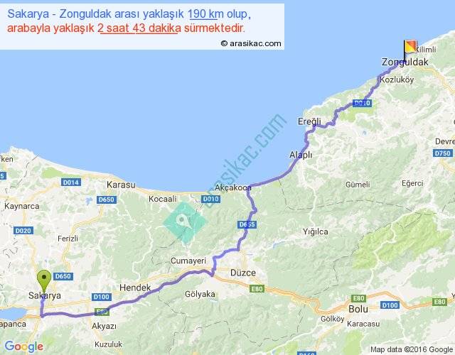 Sakarya - Zonguldak arası yaklaşık olarak 90 km/h ile yukarıda belirtilen sürede olup, iki yerin kuş uçuşu uzaklığı (mesafesi) 138'dir. Yolculuk otobüsle 3 saat 31 dakika sürmektedir.