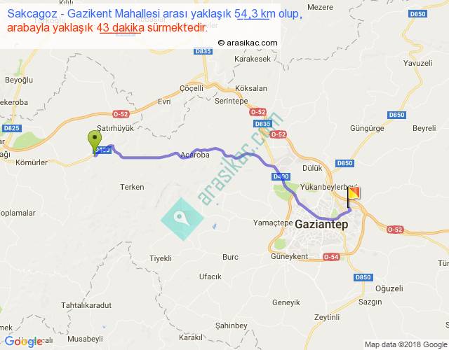 Sakcagoz - Gazikent Mahallesi arası yaklaşık olarak 90 km/h ile yukarıda belirtilen sürede olup, iki yerin kuş uçuşu uzaklığı (mesafesi) 45'dir. Yolculuk otobüsle 55 dakika sürmektedir.