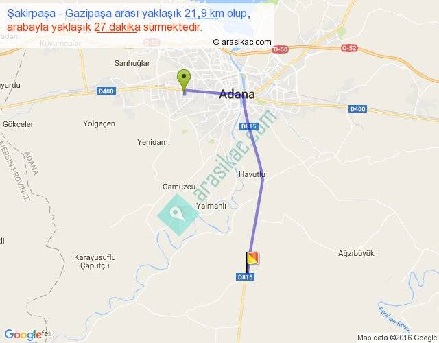 Şakirpaşa - Gazipaşa arası yaklaşık olarak 90 km/h ile yukarıda belirtilen sürede olup, iki yerin kuş uçuşu uzaklığı (mesafesi) 17'dir. Yolculuk otobüsle 35 dakika sürmektedir.