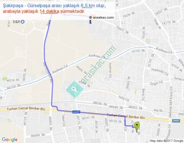 Şakirpaşa - Gürselpaşa arası yaklaşık olarak 90 km/h ile yukarıda belirtilen sürede olup, iki yerin kuş uçuşu uzaklığı (mesafesi) 3'dir. Yolculuk otobüsle 18 dakika sürmektedir.