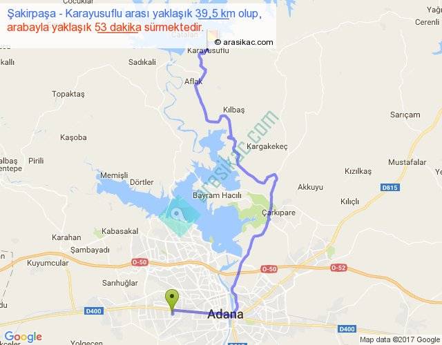 Şakirpaşa - Karayusuflu arası yaklaşık olarak 90 km/h ile yukarıda belirtilen sürede olup, iki yerin kuş uçuşu uzaklığı (mesafesi) 23'dir. Yolculuk otobüsle 1 saat 8 dakika sürmektedir.