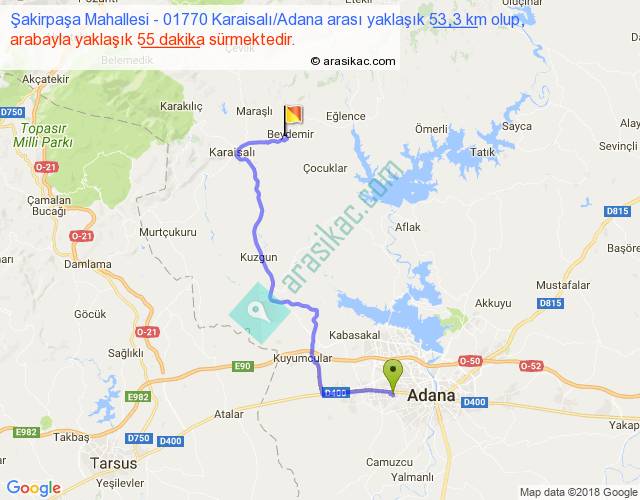 Şakirpaşa Mahallesi - 01770 Karaisalı Adana arası yaklaşık olarak 90 km/h ile yukarıda belirtilen sürede olup, iki yerin kuş uçuşu uzaklığı (mesafesi) 34'dir. Yolculuk otobüsle 1 saat 11 dakika sürmektedir.