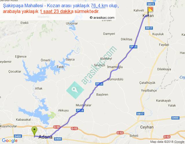 Şakirpaşa Mahallesi - Kozan arası yaklaşık olarak 90 km/h ile yukarıda belirtilen sürede olup, iki yerin kuş uçuşu uzaklığı (mesafesi) 70'dir. Yolculuk otobüsle 1 saat 47 dakika sürmektedir.