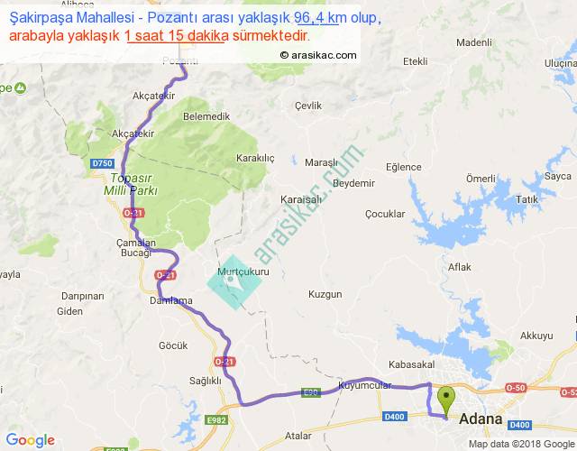 Şakirpaşa Mahallesi - Pozantı arası yaklaşık olarak 90 km/h ile yukarıda belirtilen sürede olup, iki yerin kuş uçuşu uzaklığı (mesafesi) 60'dir. Yolculuk otobüsle 1 saat 37 dakika sürmektedir.