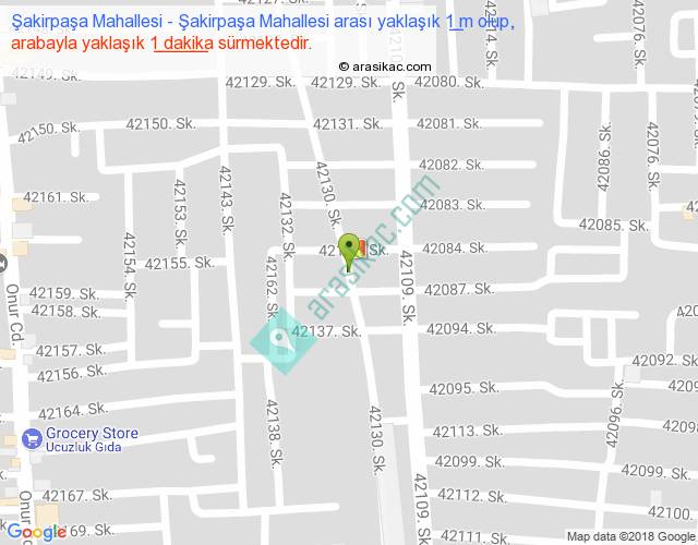Şakirpaşa Mahallesi - Şakirpaşa Mahallesi arası yaklaşık olarak 90 km/h ile yukarıda belirtilen sürede olup, iki yerin kuş uçuşu uzaklığı (mesafesi) 0'dir. Yolculuk otobüsle 1 dakika sürmektedir.