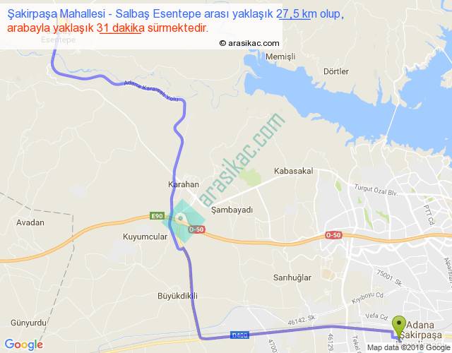 Şakirpaşa Mahallesi - Salbaş Esentepe arası yaklaşık olarak 90 km/h ile yukarıda belirtilen sürede olup, iki yerin kuş uçuşu uzaklığı (mesafesi) 20'dir. Yolculuk otobüsle 40 dakika sürmektedir.