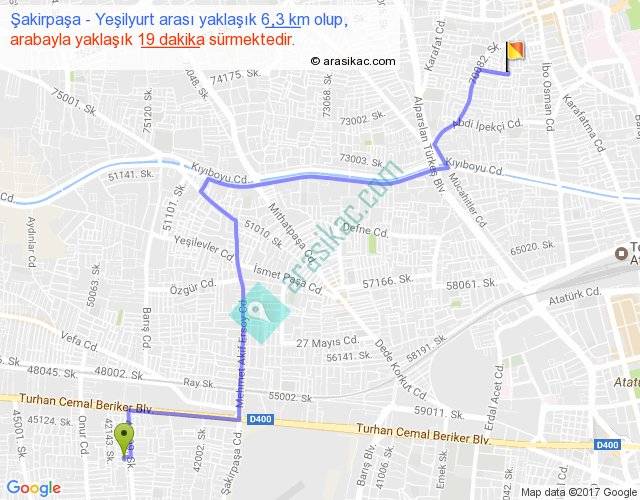 Şakirpaşa - Yeşilyurt arası yaklaşık olarak 90 km/h ile yukarıda belirtilen sürede olup, iki yerin kuş uçuşu uzaklığı (mesafesi) 4'dir. Yolculuk otobüsle 24 dakika sürmektedir.