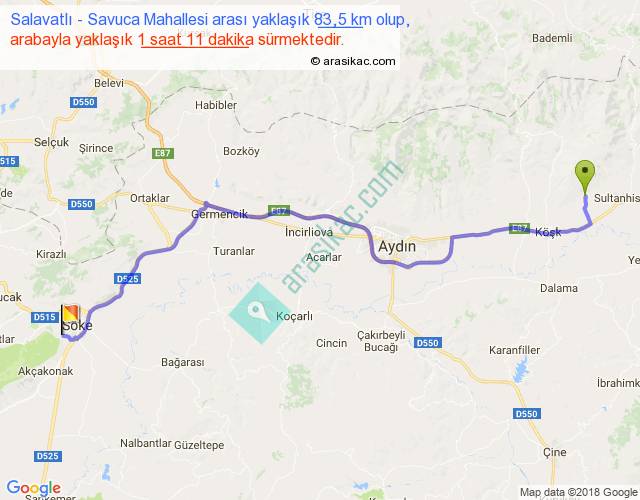 Salavatlı - Savuca Mahallesi arası yaklaşık olarak 90 km/h ile yukarıda belirtilen sürede olup, iki yerin kuş uçuşu uzaklığı (mesafesi) 65'dir. Yolculuk otobüsle 1 saat 32 dakika sürmektedir.