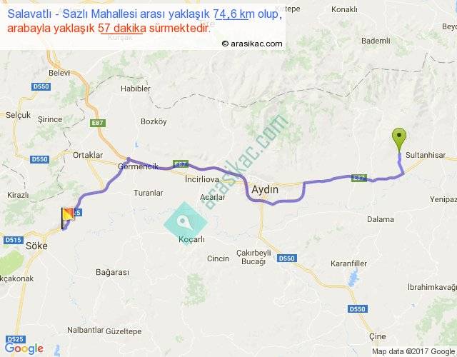 Salavatlı - Sazlı Mahallesi arası yaklaşık olarak 90 km/h ile yukarıda belirtilen sürede olup, iki yerin kuş uçuşu uzaklığı (mesafesi) 58'dir. Yolculuk otobüsle 1 saat 14 dakika sürmektedir.