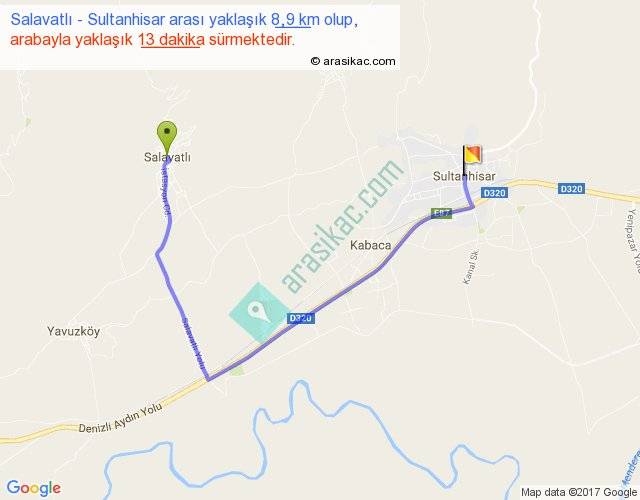 Salavatlı - Sultanhisar arası yaklaşık olarak 90 km/h ile yukarıda belirtilen sürede olup, iki yerin kuş uçuşu uzaklığı (mesafesi) 4'dir. Yolculuk otobüsle 16 dakika sürmektedir.