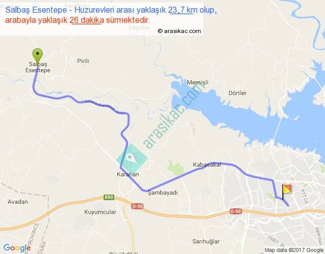 Salbaş Esentepe - Huzurevleri arası yaklaşık olarak 90 km/h ile yukarıda belirtilen sürede olup, iki yerin kuş uçuşu uzaklığı (mesafesi) 17'dir. Yolculuk otobüsle 33 dakika sürmektedir.
