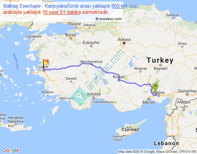 Salbaş Esentepe - Karşıyaka İzmir arası yaklaşık olarak 90 km/h ile yukarıda belirtilen sürede olup, iki yerin kuş uçuşu uzaklığı (mesafesi) 713'dir. Eğer belirtilen yerler arasında uçak seferi var ise bu süre uçakla 1 saat 05 dakika'ya kadar düşebilir. Yolculuk otobüsle 14 saat 6 dakika sürmektedir.