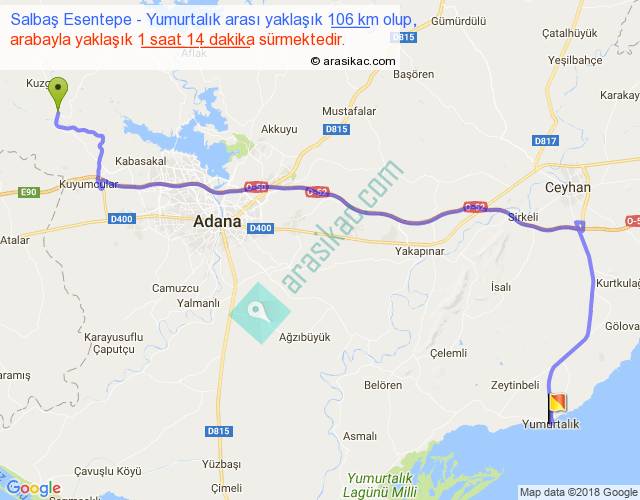 Salbaş Esentepe - Yumurtalık arası yaklaşık olarak 90 km/h ile yukarıda belirtilen sürede olup, iki yerin kuş uçuşu uzaklığı (mesafesi) 71'dir. Yolculuk otobüsle 1 saat 36 dakika sürmektedir.