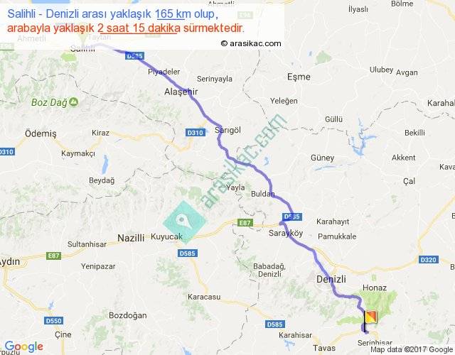 Salihli - Denizli arası yaklaşık olarak 90 km/h ile yukarıda belirtilen sürede olup, iki yerin kuş uçuşu uzaklığı (mesafesi) 135'dir. Yolculuk otobüsle 2 saat 47 dakika sürmektedir.