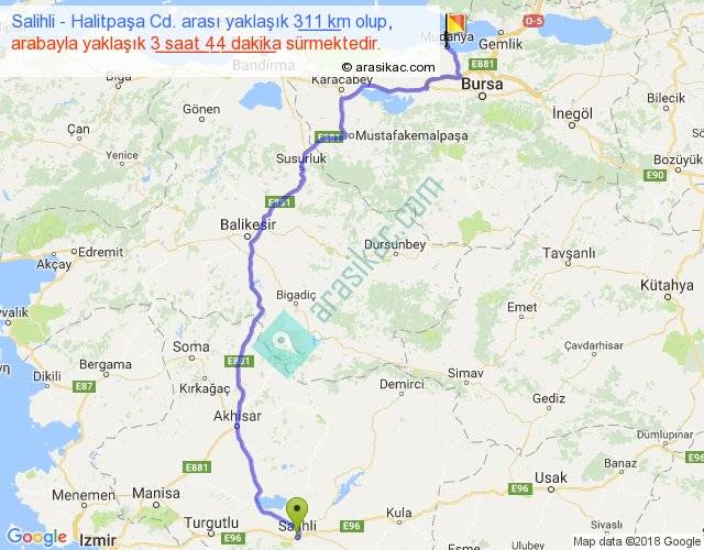 Salihli - Halitpaşa Cd. arası yaklaşık olarak 90 km/h ile yukarıda belirtilen sürede olup, iki yerin kuş uçuşu uzaklığı (mesafesi) 218'dir. Yolculuk otobüsle 4 saat 51 dakika sürmektedir.