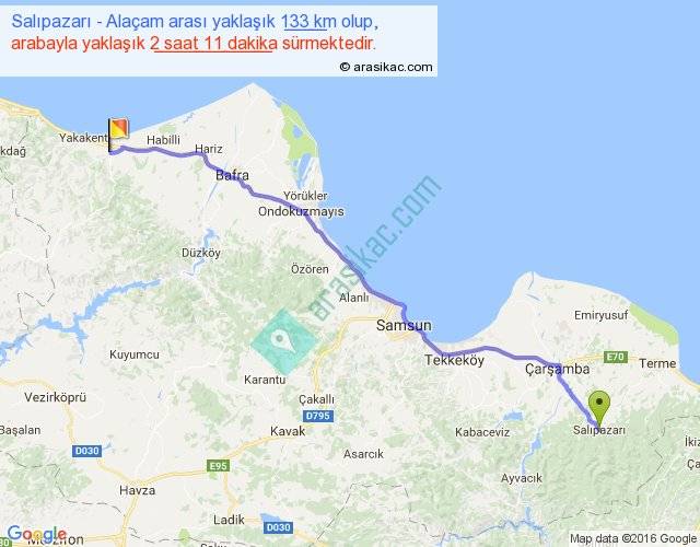 Salıpazarı - Alaçam arası yaklaşık olarak 90 km/h ile yukarıda belirtilen sürede olup, iki yerin kuş uçuşu uzaklığı (mesafesi) 117'dir. Yolculuk otobüsle 2 saat 50 dakika sürmektedir.