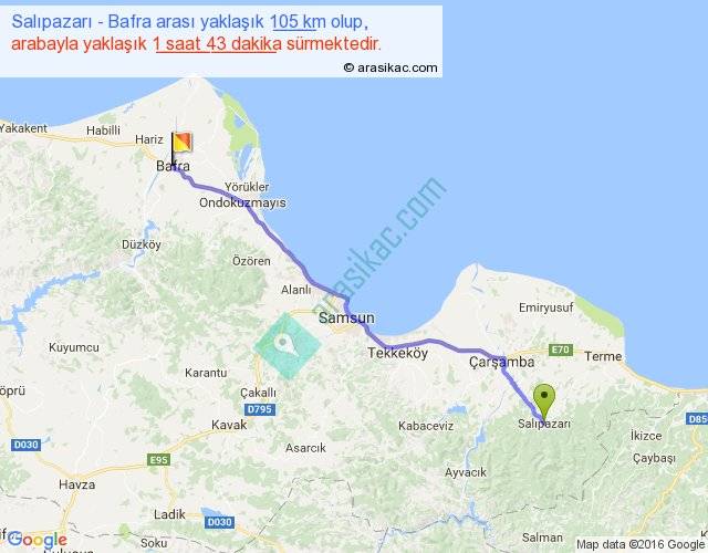 Salıpazarı - Bafra arası yaklaşık olarak 90 km/h ile yukarıda belirtilen sürede olup, iki yerin kuş uçuşu uzaklığı (mesafesi) 93'dir. Yolculuk otobüsle 2 saat 13 dakika sürmektedir.