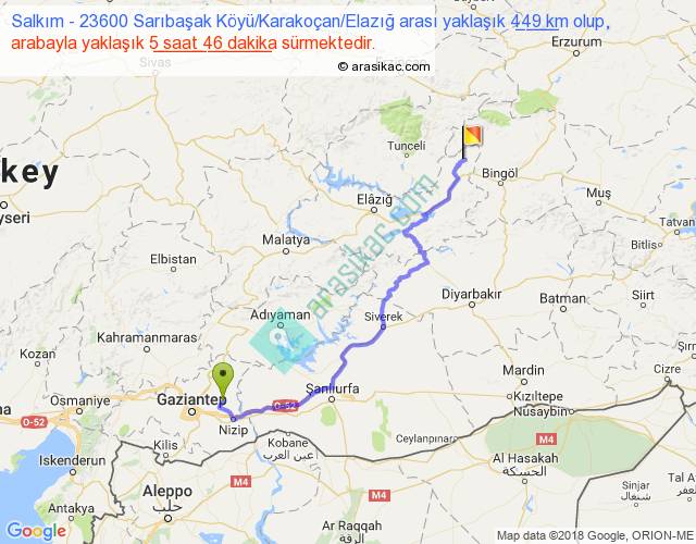 Salkım - 23600 Sarıbaşak Köyü Karakoçan Elazığ arası yaklaşık olarak 90 km/h ile yukarıda belirtilen sürede olup, iki yerin kuş uçuşu uzaklığı (mesafesi) 301'dir. Eğer belirtilen yerler arasında uçak seferi var ise bu süre uçakla 27 dakika'ya kadar düşebilir. Yolculuk otobüsle 7 saat 29 dakika sürmektedir.