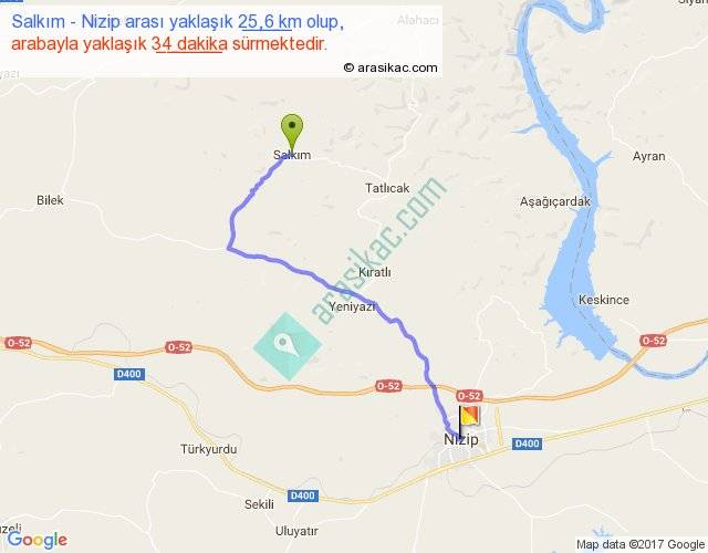 Salkım - Nizip arası yaklaşık olarak 90 km/h ile yukarıda belirtilen sürede olup, iki yerin kuş uçuşu uzaklığı (mesafesi) 18'dir. Yolculuk otobüsle 44 dakika sürmektedir.
