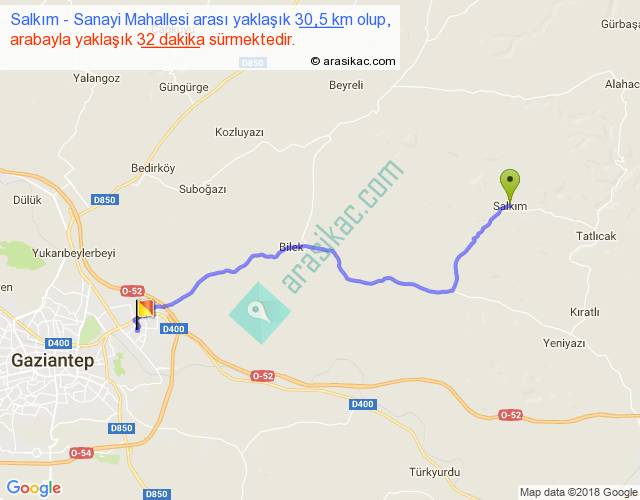 Salkım - Sanayi Mahallesi arası yaklaşık olarak 90 km/h ile yukarıda belirtilen sürede olup, iki yerin kuş uçuşu uzaklığı (mesafesi) 24'dir. Yolculuk otobüsle 41 dakika sürmektedir.
