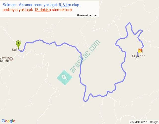 Salman - Akpınar arası yaklaşık olarak 90 km/h ile yukarıda belirtilen sürede olup, iki yerin kuş uçuşu uzaklığı (mesafesi) 3'dir. Yolculuk otobüsle 23 dakika sürmektedir.