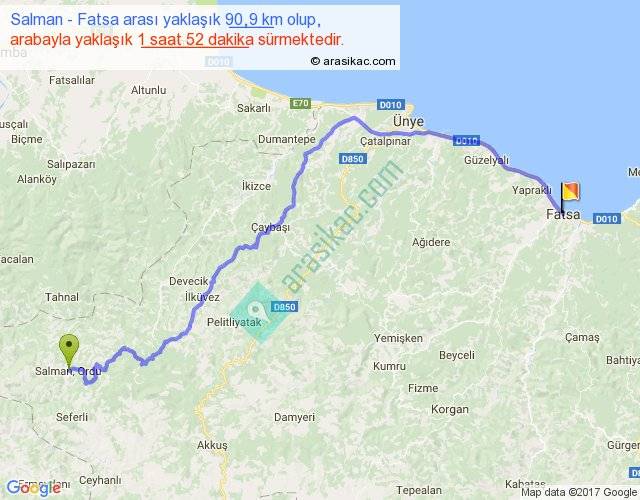 Salman - Fatsa arası yaklaşık olarak 90 km/h ile yukarıda belirtilen sürede olup, iki yerin kuş uçuşu uzaklığı (mesafesi) 59'dir. Yolculuk otobüsle 2 saat 25 dakika sürmektedir.