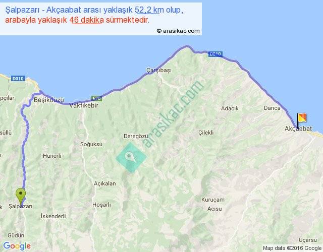 Şalpazarı - Akçaabat arası yaklaşık olarak 90 km/h ile yukarıda belirtilen sürede olup, iki yerin kuş uçuşu uzaklığı (mesafesi) 33'dir. Yolculuk otobüsle 59 dakika sürmektedir.