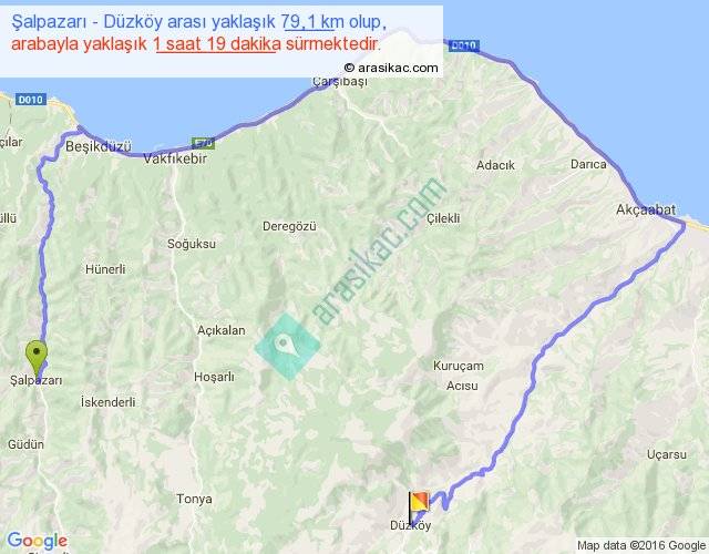 Şalpazarı - Düzköy arası yaklaşık olarak 90 km/h ile yukarıda belirtilen sürede olup, iki yerin kuş uçuşu uzaklığı (mesafesi) 21'dir. Yolculuk otobüsle 1 saat 42 dakika sürmektedir.