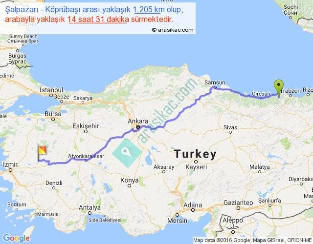 Şalpazarı - Köprübaşı arası yaklaşık olarak 90 km/h ile yukarıda belirtilen sürede olup, iki yerin kuş uçuşu uzaklığı (mesafesi) 947'dir. Eğer belirtilen yerler arasında uçak seferi var ise bu süre uçakla 1 saat 27 dakika'ya kadar düşebilir. Yolculuk otobüsle 18 saat 52 dakika sürmektedir.