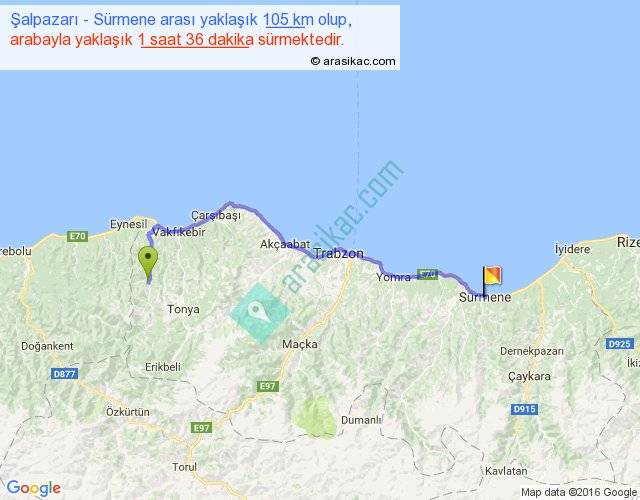Şalpazarı - Sürmene arası yaklaşık olarak 90 km/h ile yukarıda belirtilen sürede olup, iki yerin kuş uçuşu uzaklığı (mesafesi) 77'dir. Yolculuk otobüsle 2 saat 4 dakika sürmektedir.