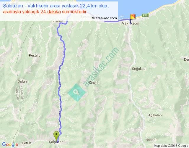 Şalpazarı - Vakfıkebir arası yaklaşık olarak 90 km/h ile yukarıda belirtilen sürede olup, iki yerin kuş uçuşu uzaklığı (mesafesi) 14'dir. Yolculuk otobüsle 31 dakika sürmektedir.