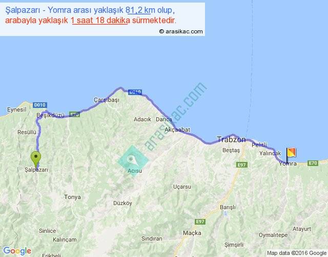 Şalpazarı - Yomra arası yaklaşık olarak 90 km/h ile yukarıda belirtilen sürede olup, iki yerin kuş uçuşu uzaklığı (mesafesi) 56'dir. Yolculuk otobüsle 1 saat 41 dakika sürmektedir.