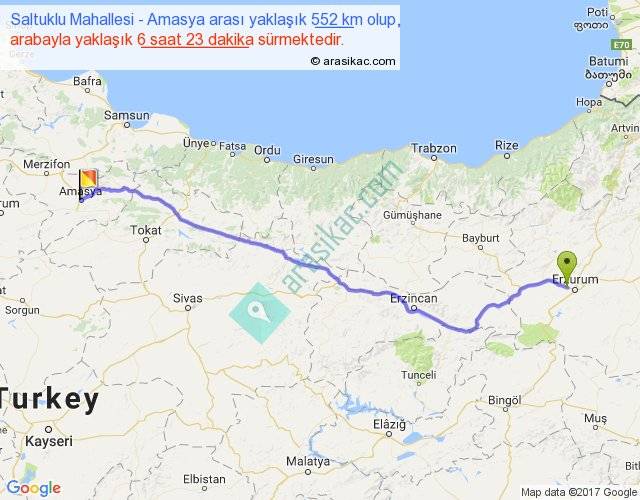 Saltuklu Mahallesi - Amasya arası yaklaşık olarak 90 km/h ile yukarıda belirtilen sürede olup, iki yerin kuş uçuşu uzaklığı (mesafesi) 457'dir. Eğer belirtilen yerler arasında uçak seferi var ise bu süre uçakla 42 dakika'ya kadar düşebilir. Yolculuk otobüsle 8 saat 17 dakika sürmektedir.