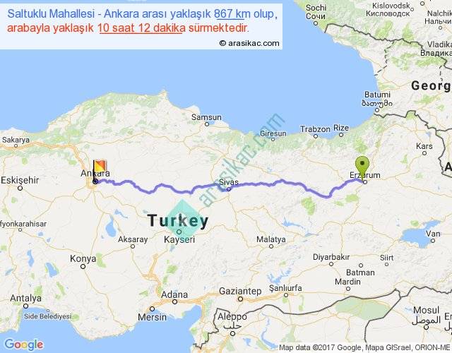 Saltuklu Mahallesi - Ankara arası yaklaşık olarak 90 km/h ile yukarıda belirtilen sürede olup, iki yerin kuş uçuşu uzaklığı (mesafesi) 705'dir. Eğer belirtilen yerler arasında uçak seferi var ise bu süre uçakla 1 saat 05 dakika'ya kadar düşebilir. Yolculuk otobüsle 13 saat 15 dakika sürmektedir.