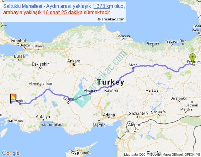 Saltuklu Mahallesi - Aydın arası yaklaşık olarak 90 km/h ile yukarıda belirtilen sürede olup, iki yerin kuş uçuşu uzaklığı (mesafesi) 1117'dir. Eğer belirtilen yerler arasında uçak seferi var ise bu süre uçakla 1 saat 43 dakika'ya kadar düşebilir. Yolculuk otobüsle 21 saat 20 dakika sürmektedir.