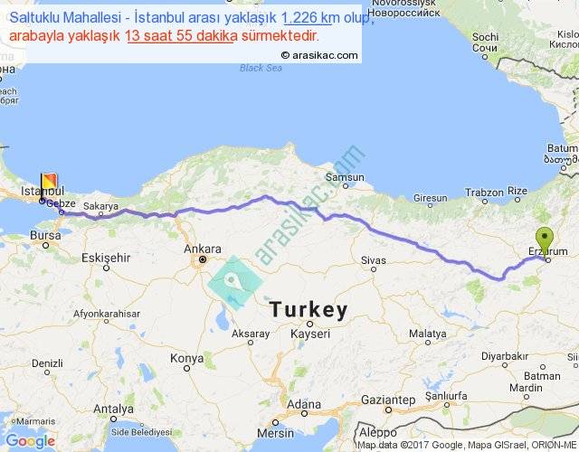 Saltuklu Mahallesi - İstanbul arası yaklaşık olarak 90 km/h ile yukarıda belirtilen sürede olup, iki yerin kuş uçuşu uzaklığı (mesafesi) 1032'dir. Eğer belirtilen yerler arasında uçak seferi var ise bu süre uçakla 1 saat 35 dakika'ya kadar düşebilir. Yolculuk otobüsle 18 saat 5 dakika sürmektedir.