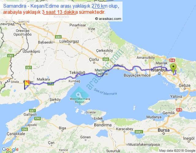 Samandira - Keşan Edirne arası yaklaşık olarak 90 km/h ile yukarıda belirtilen sürede olup, iki yerin kuş uçuşu uzaklığı (mesafesi) 224'dir. Yolculuk otobüsle 4 saat 10 dakika sürmektedir.